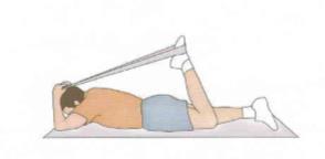Hasta diz arkasından elastik bant geçirin, diğer ucunu masa bacağına bağlayın. SağLam bacagınızı yerden kaldırın. Dengenizi saglamak icin bir sandalyeye tutunun.